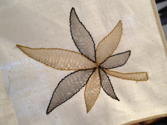薄い布に、刺繍を刺し、模様を影のように透けてみせる